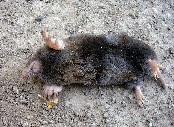 The mole, walking along its course, runs into a fishing hook and it hooks into the body, piercing the skin. The animal cannot be released, pulls on the fishing line, which is visible on the surface (sometimes a bell is attached to the pin, which at this moment starts to ring). After that, the gardener can only dig out the passage with a garden scoop and pull the resting mole to the surface right behind the fishing line.